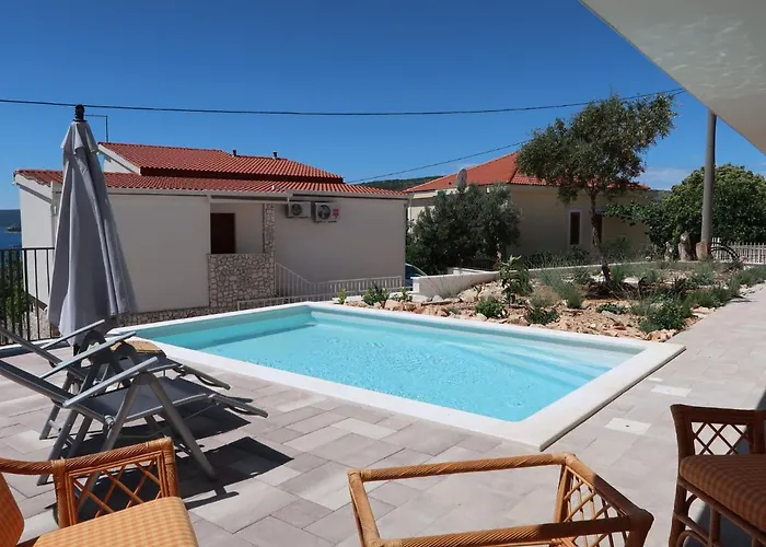 Hűtő, sütő és konyhai edények is rendelkezésre állnak. A Split repülőtér körülbelül 20 percnyi autóútra van. A vendégek úszhatnak egyet a szezonális kinti medencében.